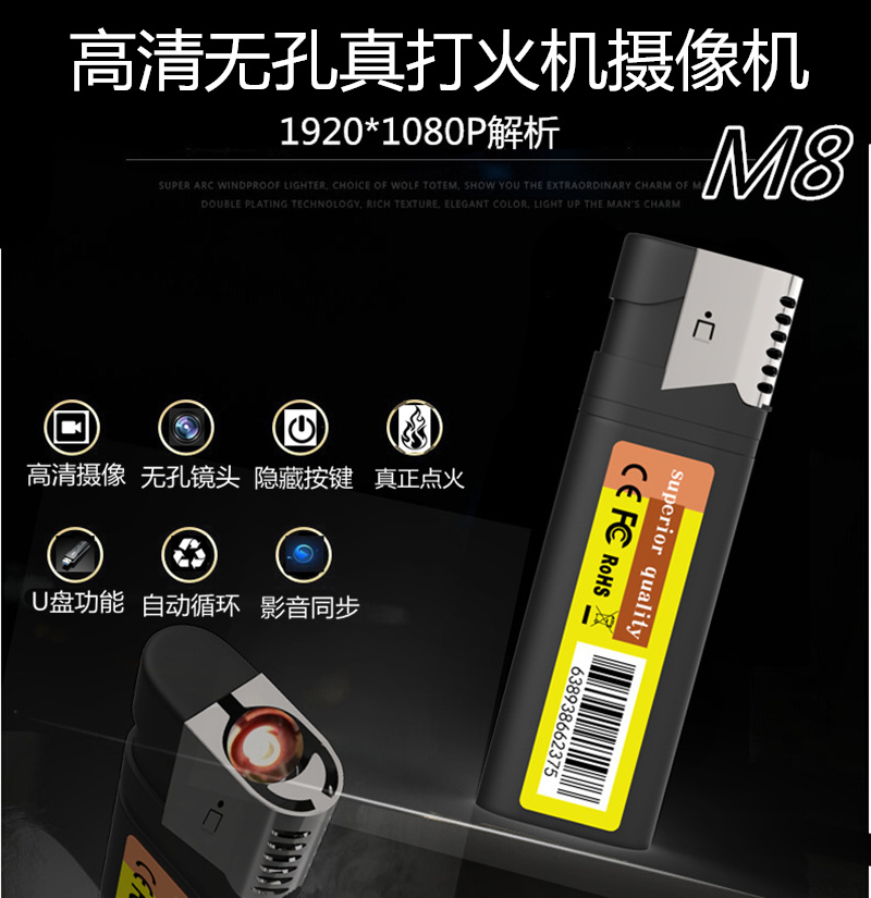 M8高清1080P无孔打火机摄像机,无孔设计,超隐蔽。本产品具有高清 摄像,影音同步,自动循环摄像,打火机功能,U盘功能。高清1920*1080P像素,无孔隐藏式镜头,隐藏式按键,可点火打火机功能。完美的设计,打火机机身大小和普通打火机一样。